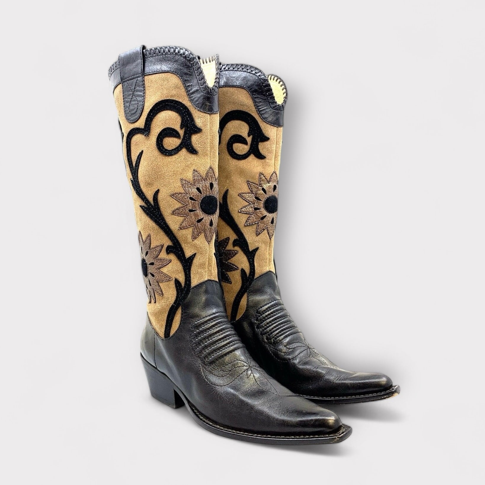Paolo Womens Western Fashion Boots | 4M | Black/Brown Suede with Floral Embroidery | EUC