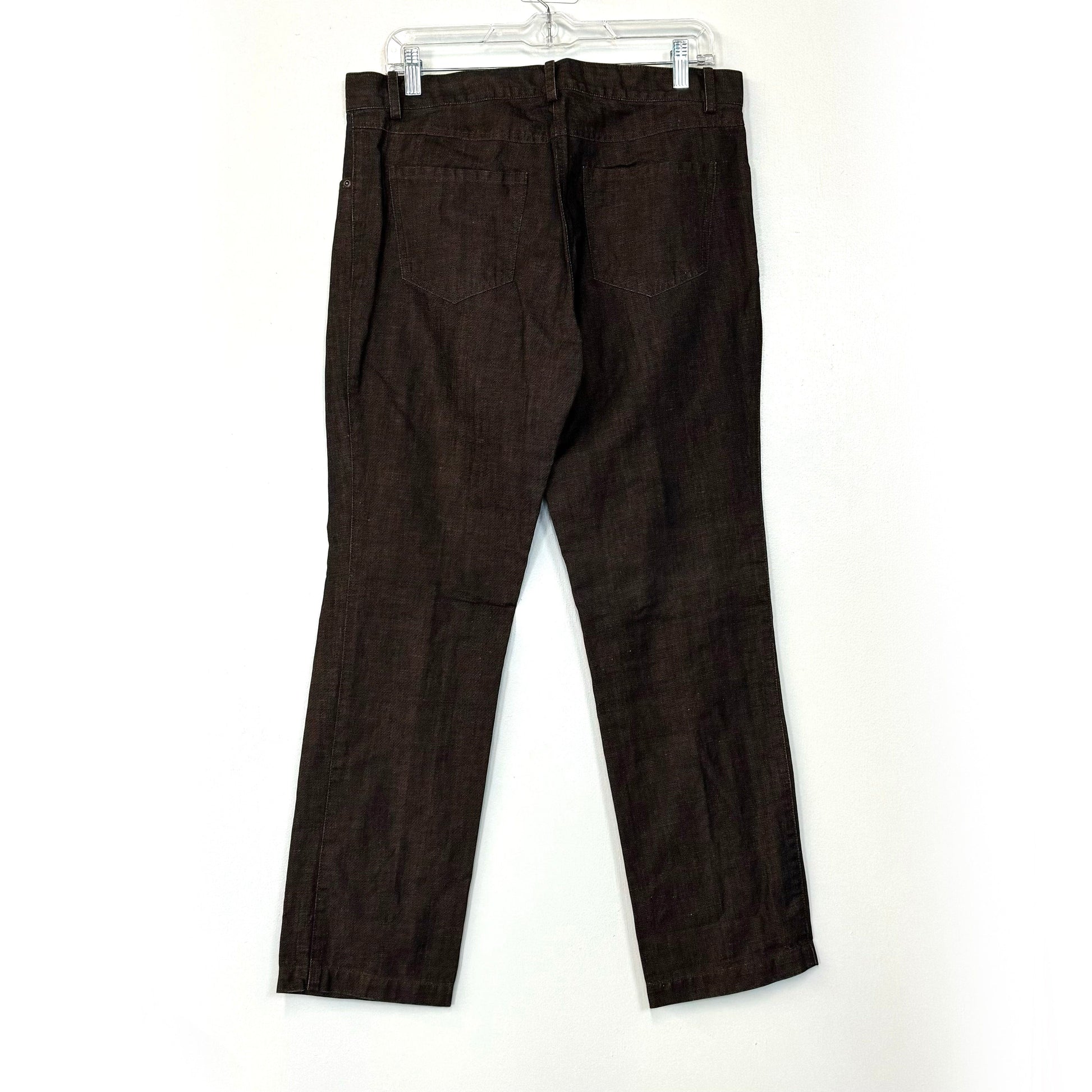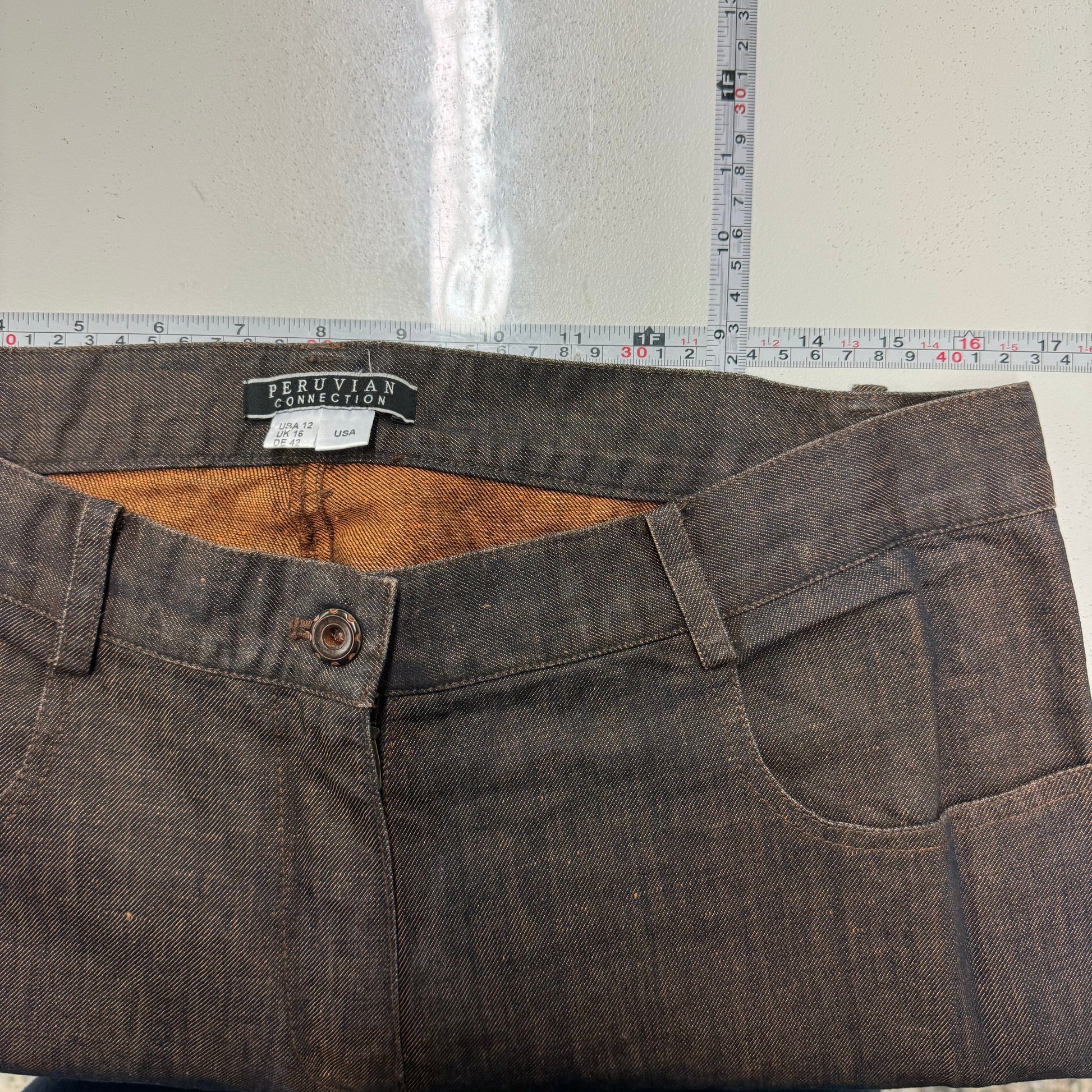 Peruvian Connection Women's Linen Denim Over Dye Jeans - Pre-Owned Size 12 for Casual Wear - Color: Brown