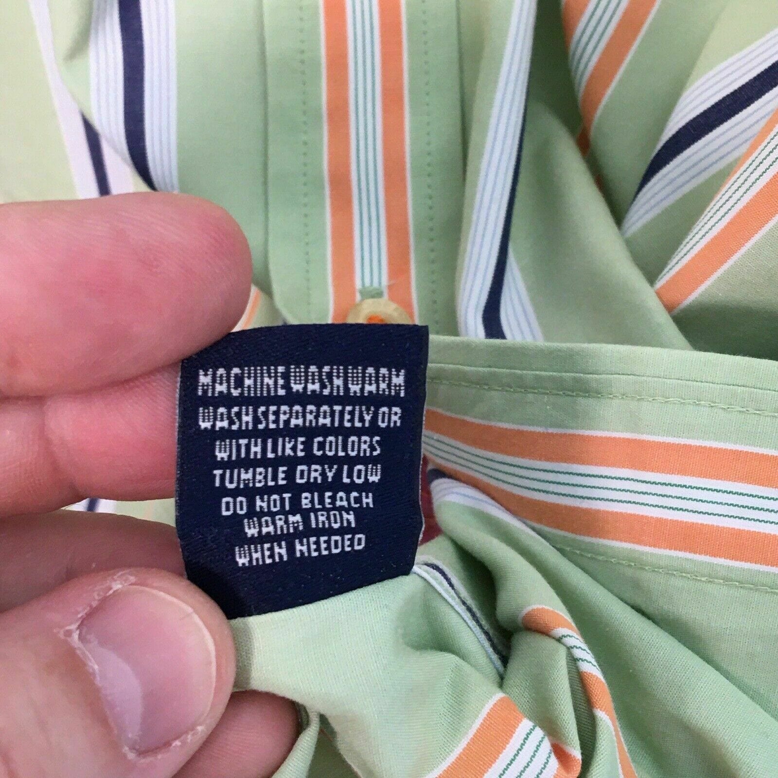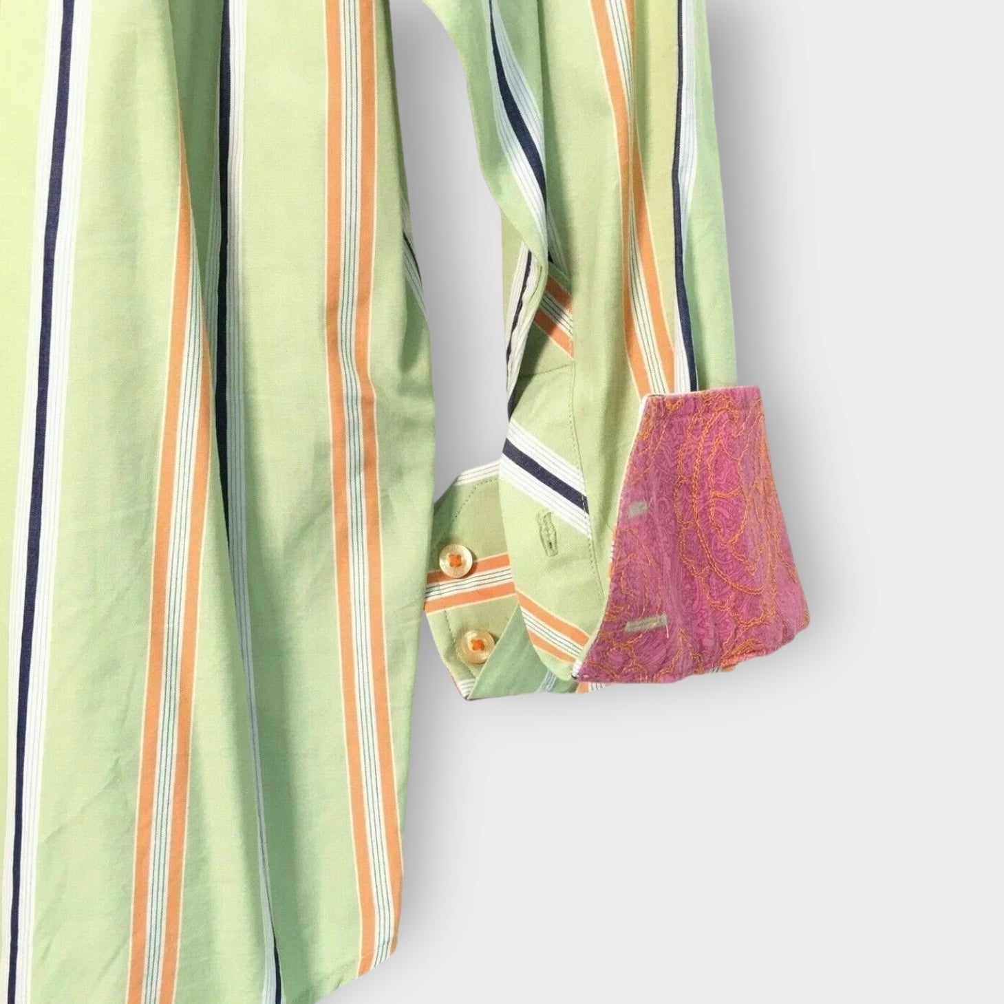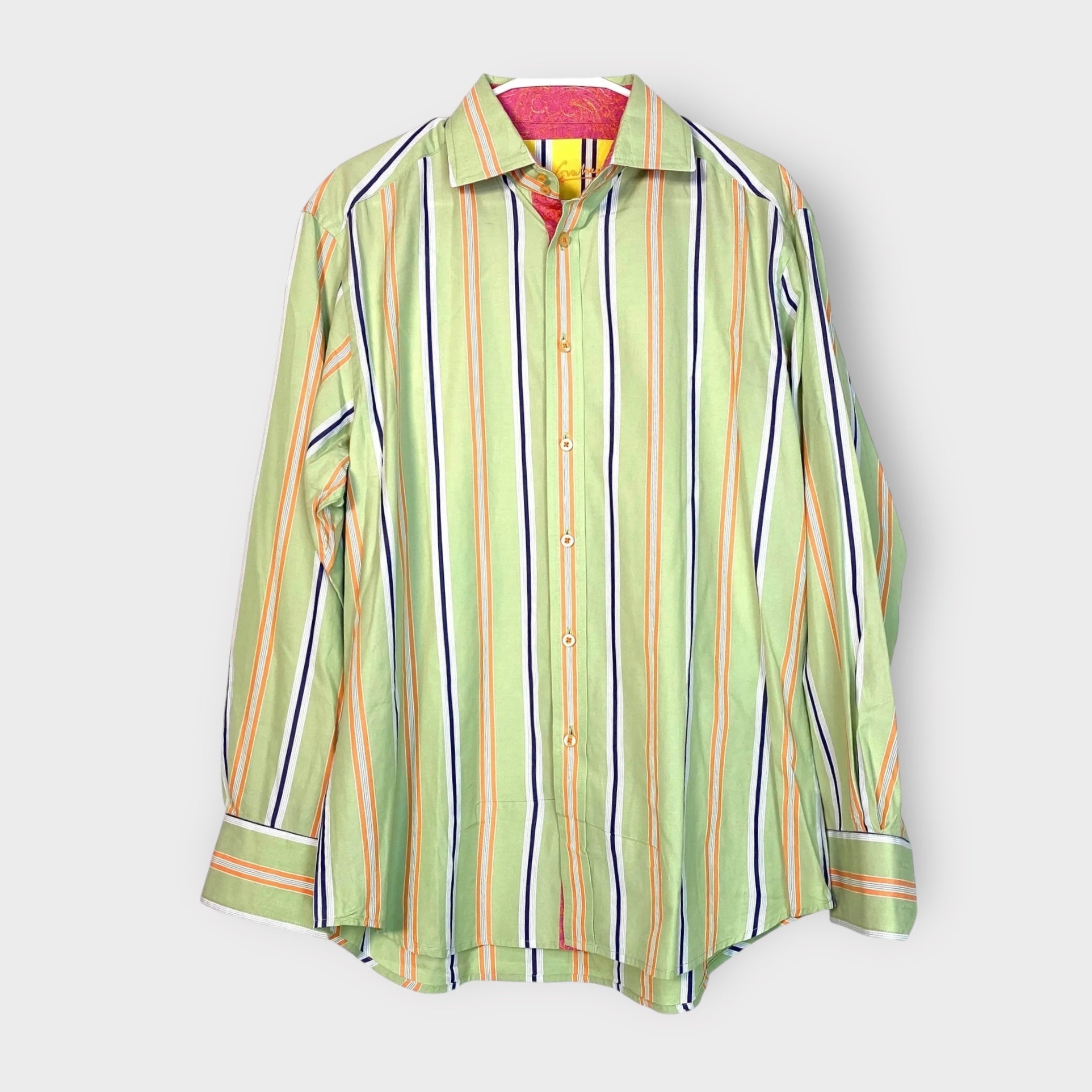 Unleash your unique style with this classic yet bold Robert Graham men’s shirt. Featuring vibrant green, orange, and navy stripes, this long-sleeve button-up is crafted from 100% cotton for ultimate comfort and breathability. The embroidered cuffs and signature contrasting paisley inner trim add a distinct touch of sophistication, making it perfect for both casual and dressier occasions.