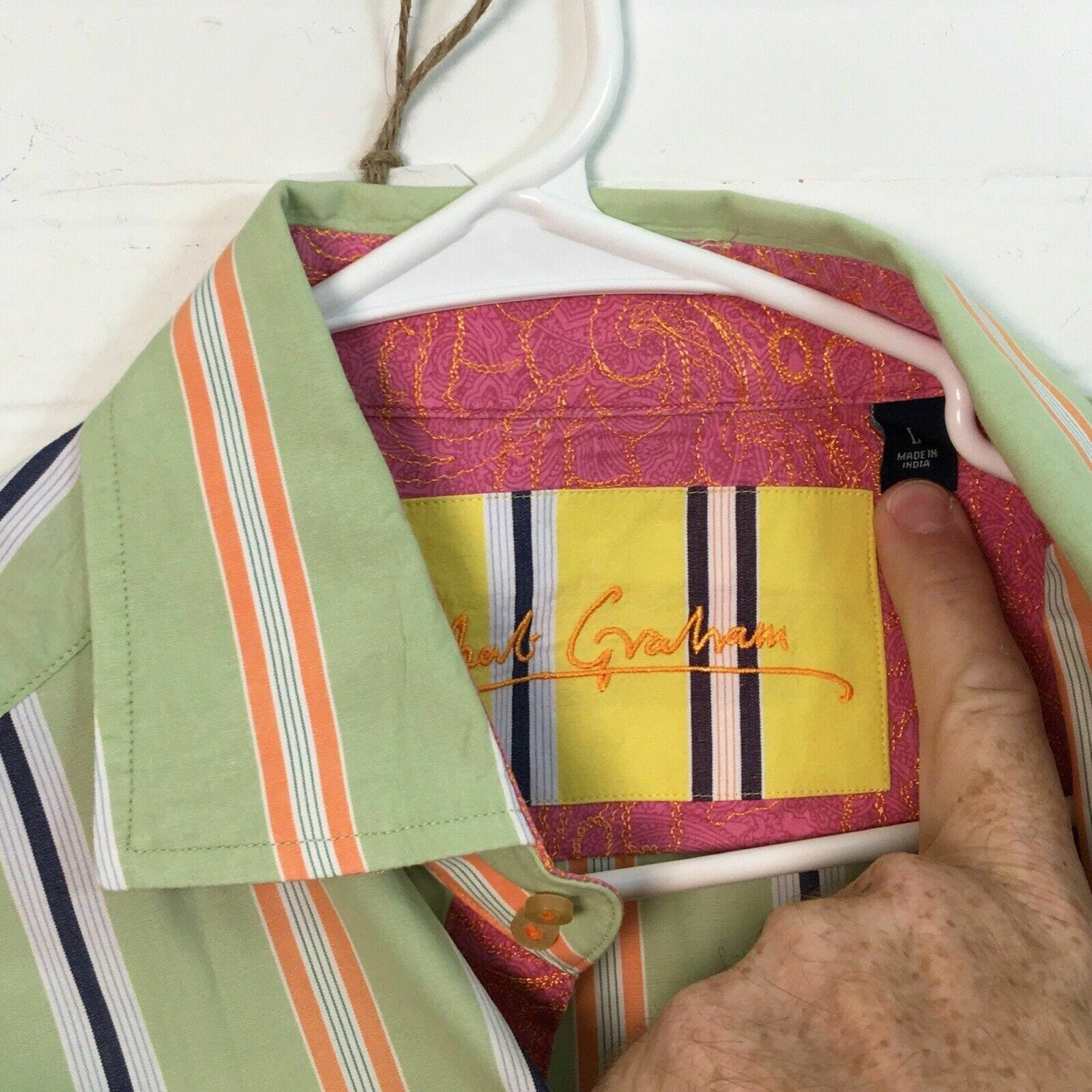 Robert Graham Men's Green Multi-Stripe Button-Up Shirt - 100% Cotton - Size L - Excellent Condition