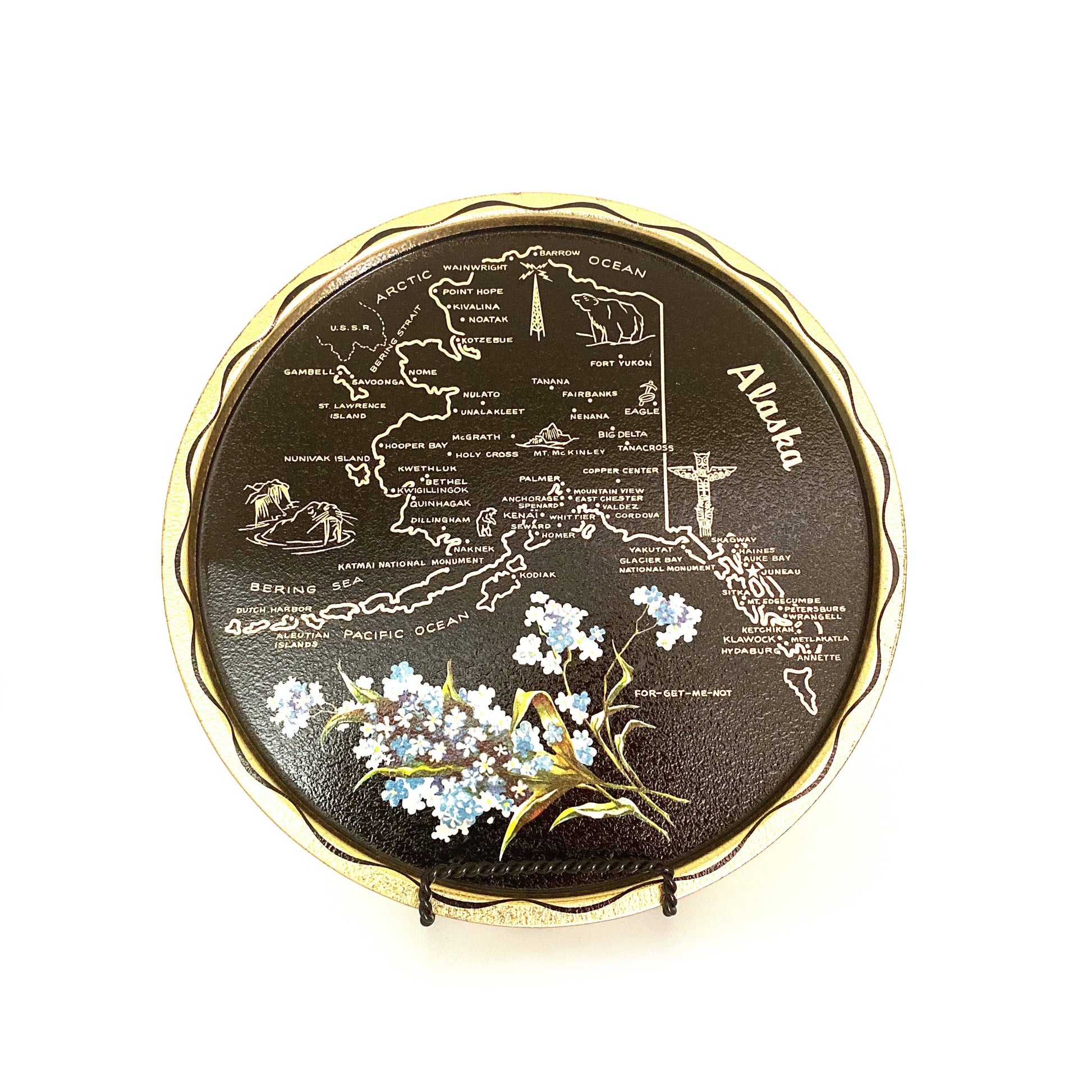 Discover the beauty of Alaska with this stunning collectible plate. Featuring a black and gold map design, it showcases the state's points of interest. Made in the USA, this vintage plate is a perfect souvenir for travel enthusiasts.