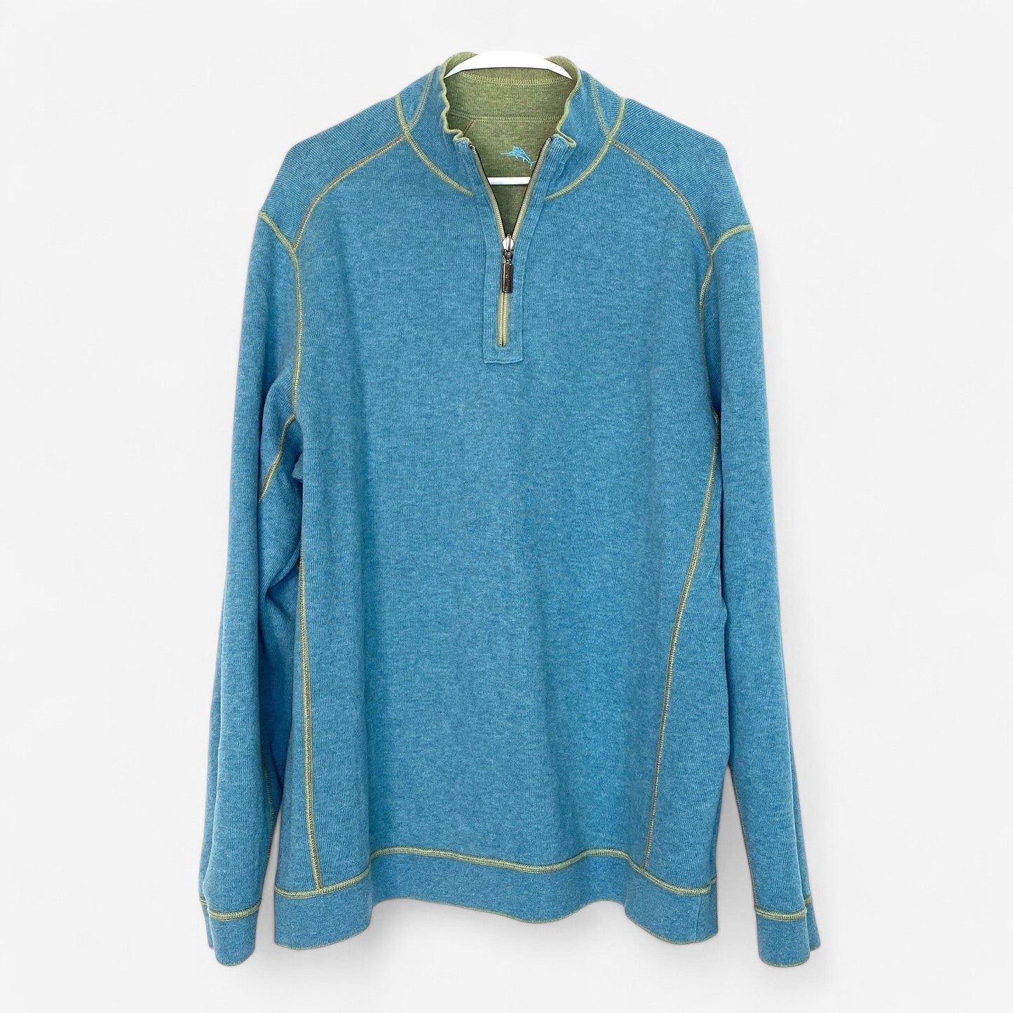 Elevate your wardrobe with this versatile Tommy Bahama Men's 1/4 Zip Pullover Sweater, featuring a reversible design in green and blue, perfect for adapting to various styles and occasions.