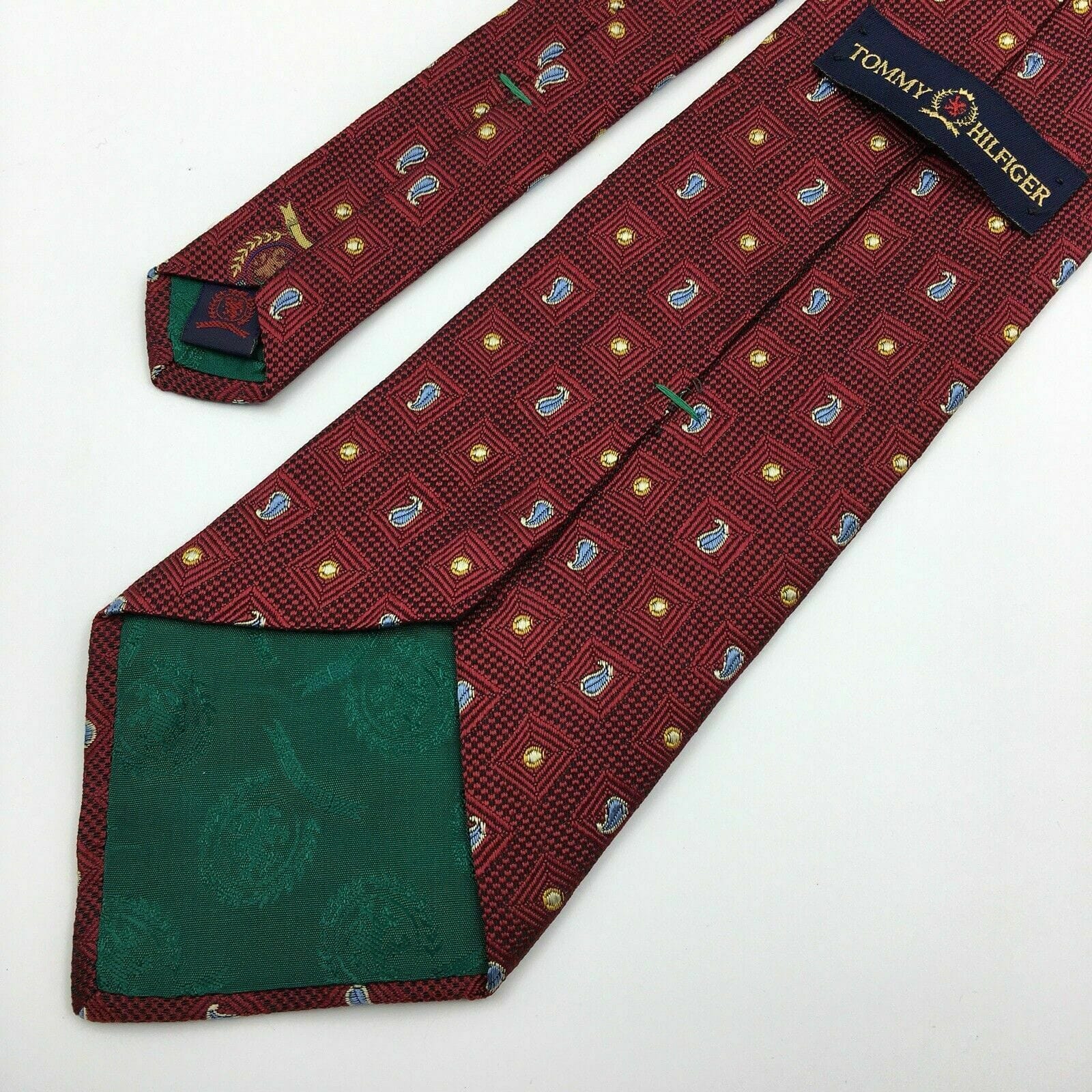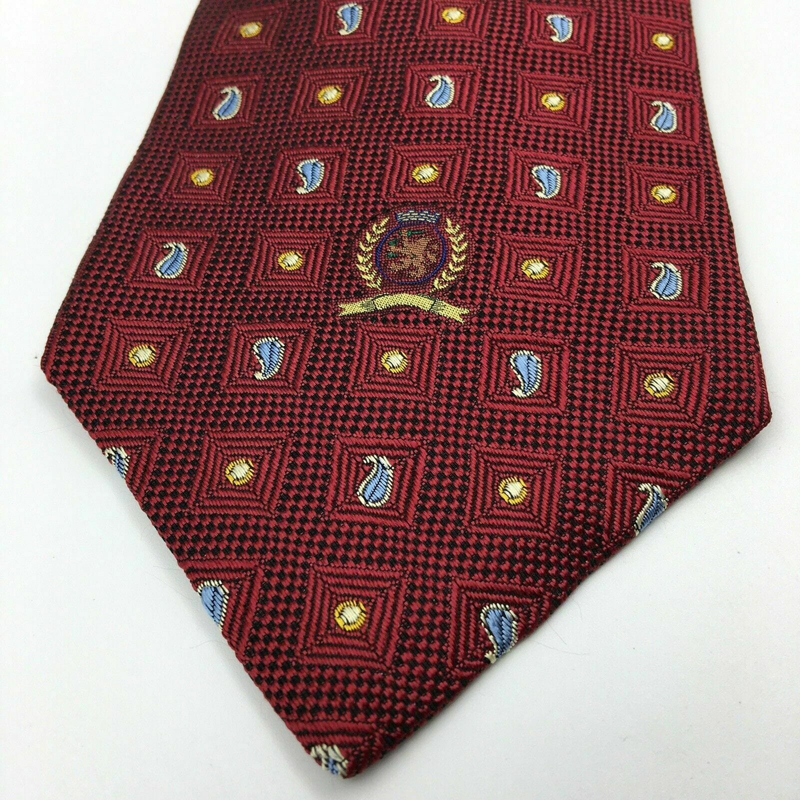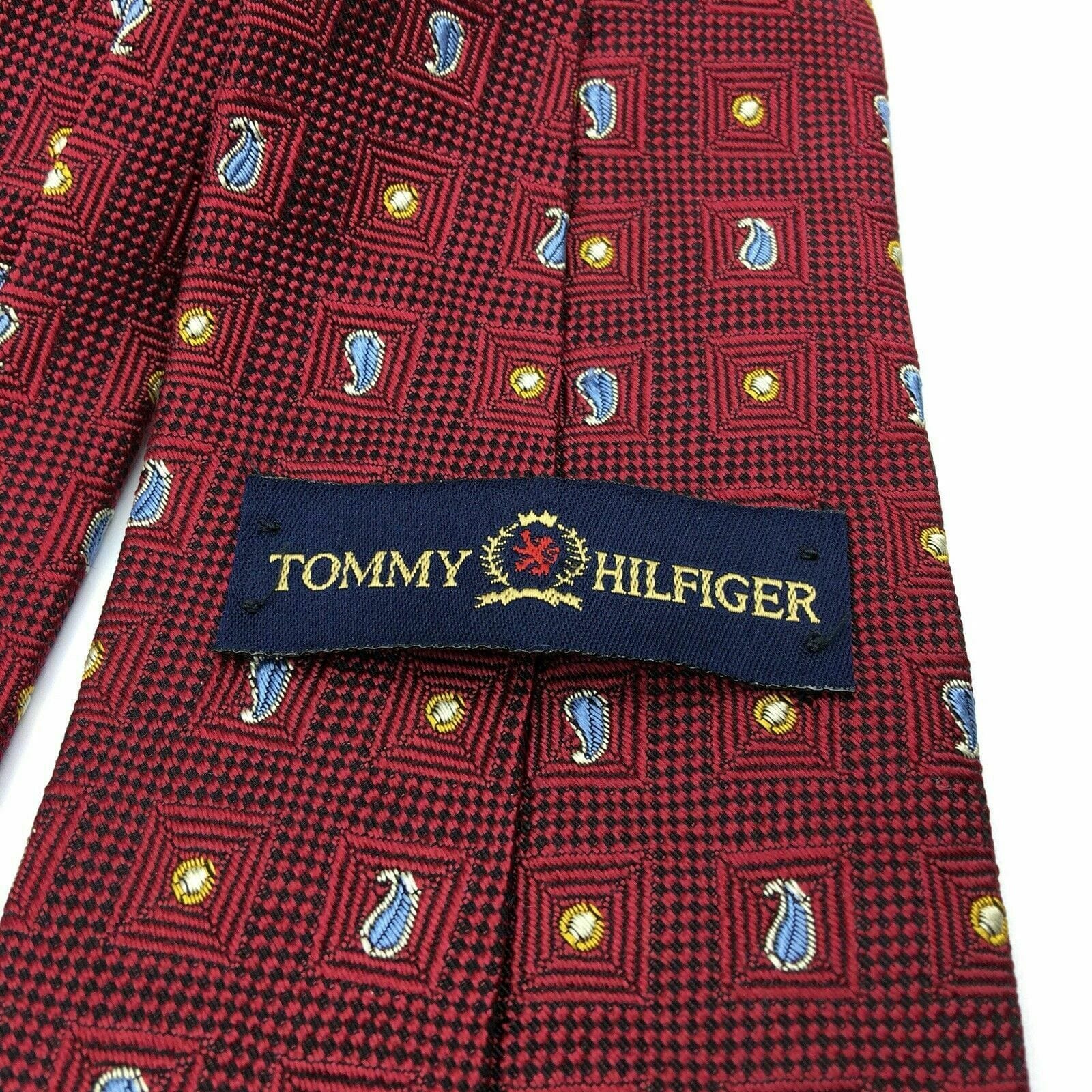 Tommy Hilfiger Mens Red Paisley Logo Square Pattern 100% Silk Neck Tie 58” X 4”