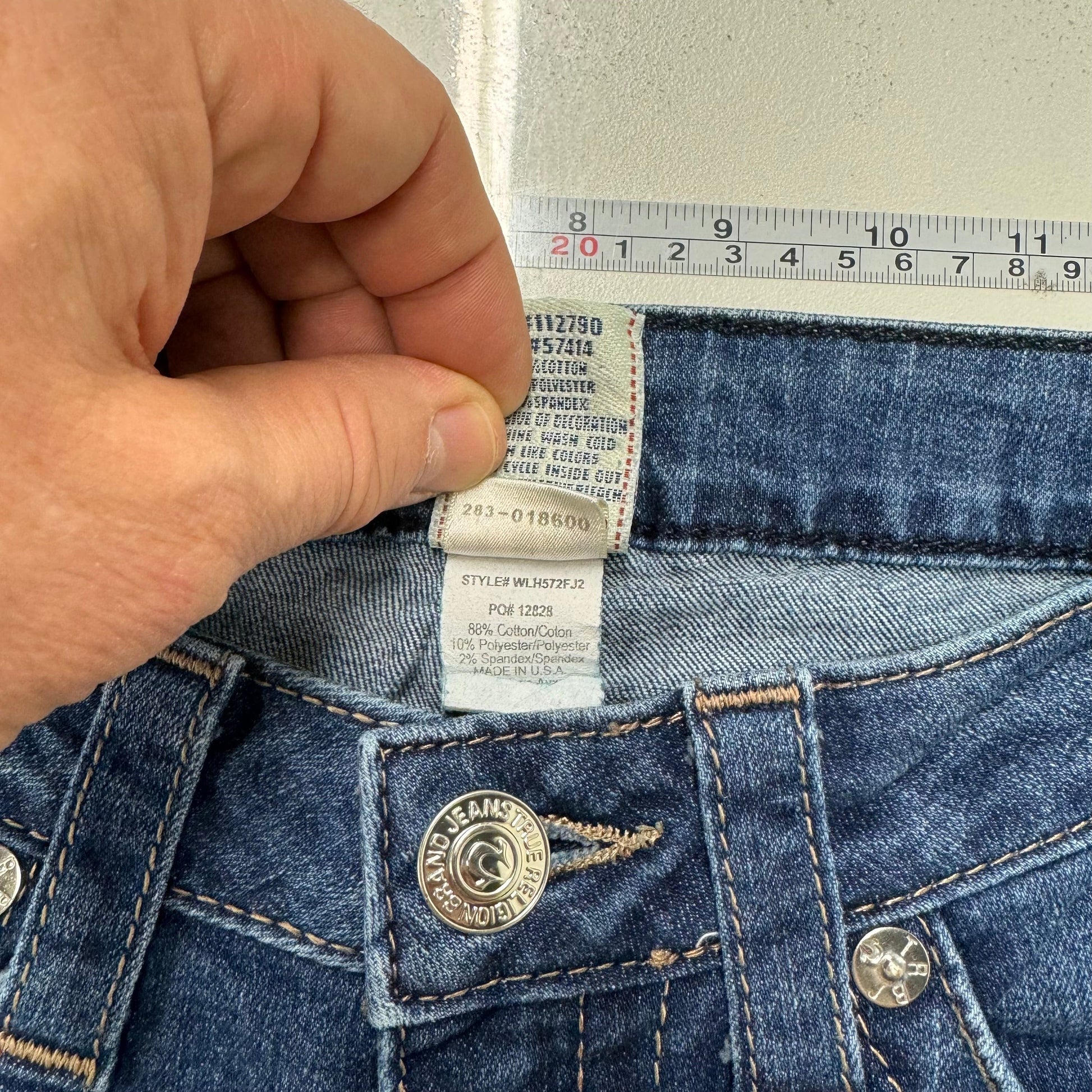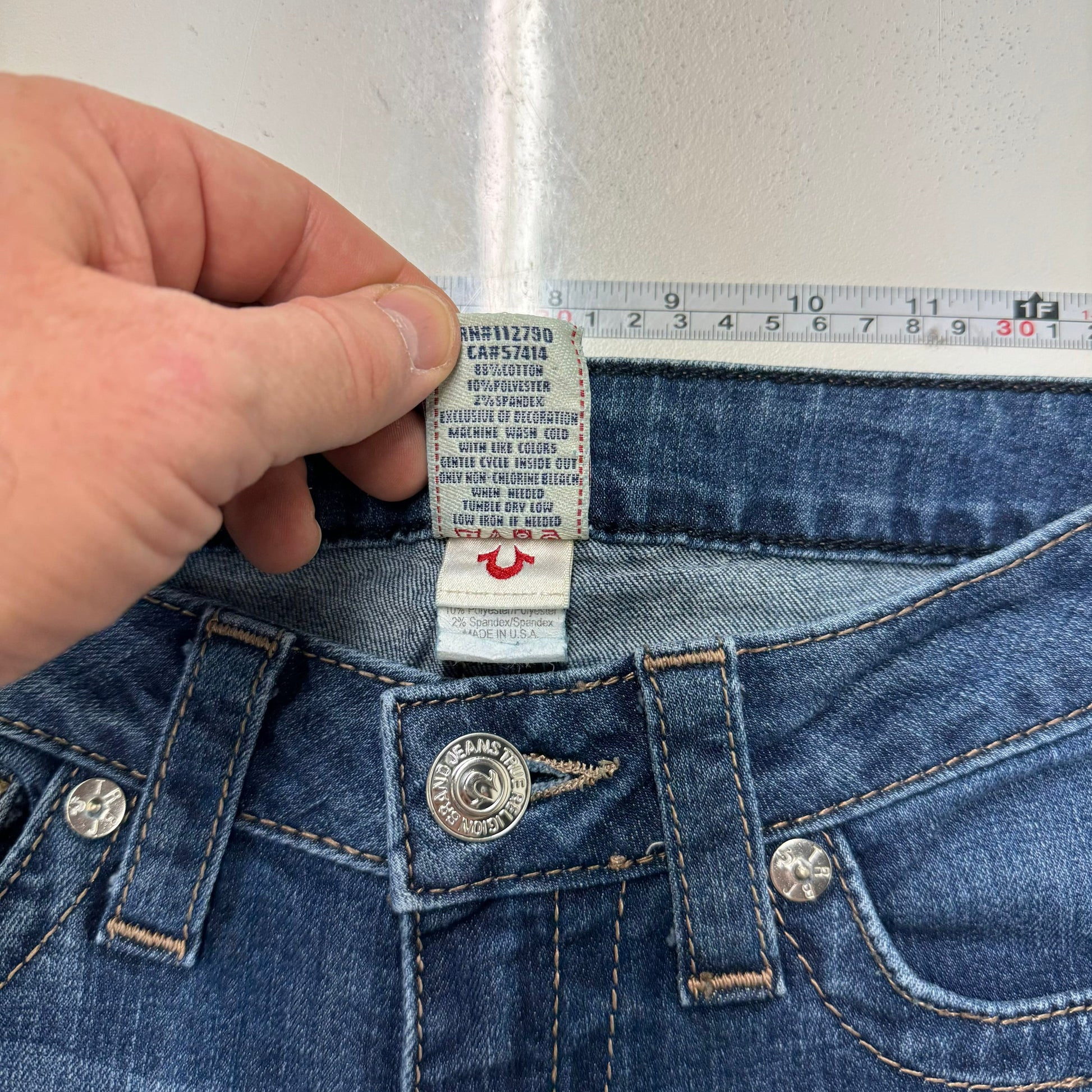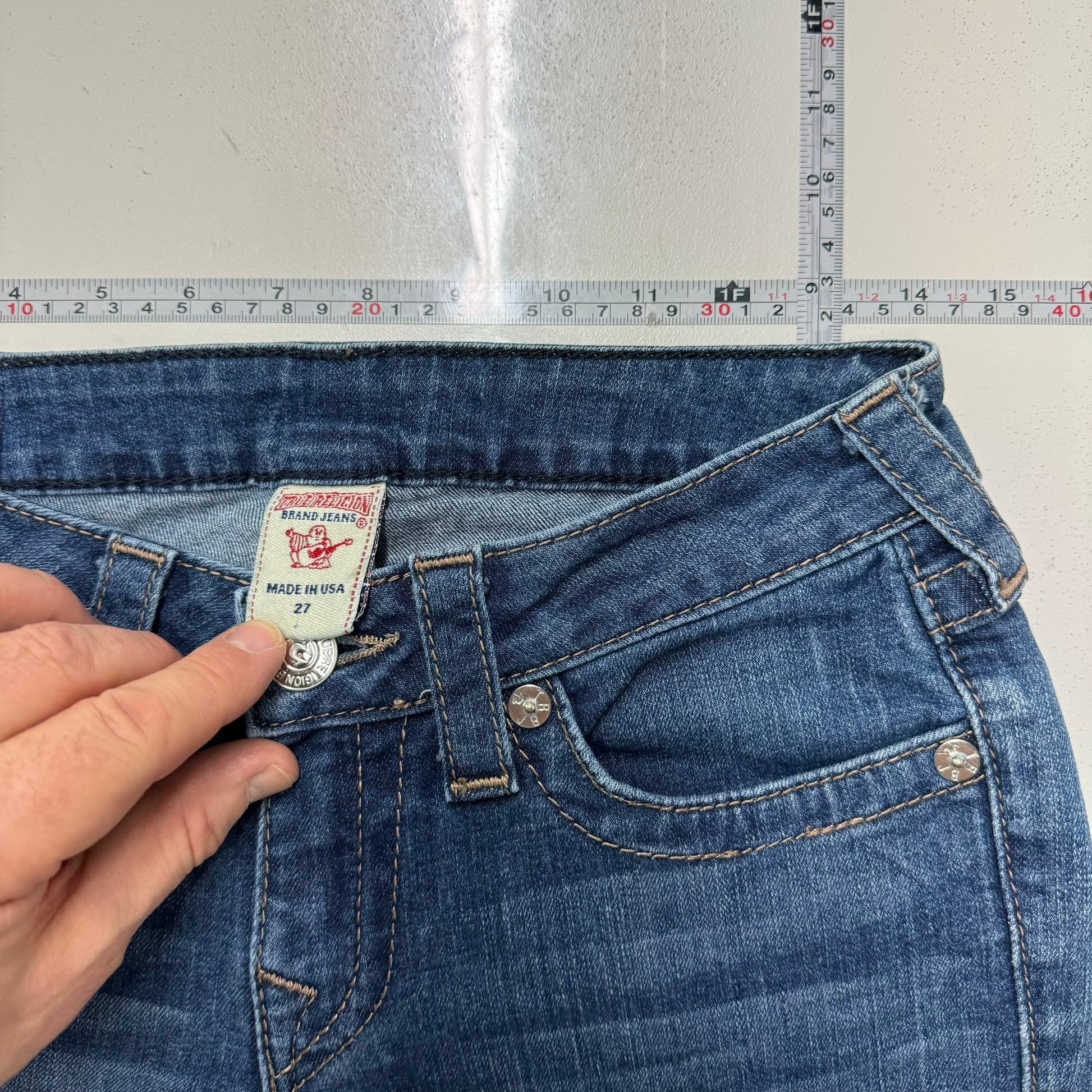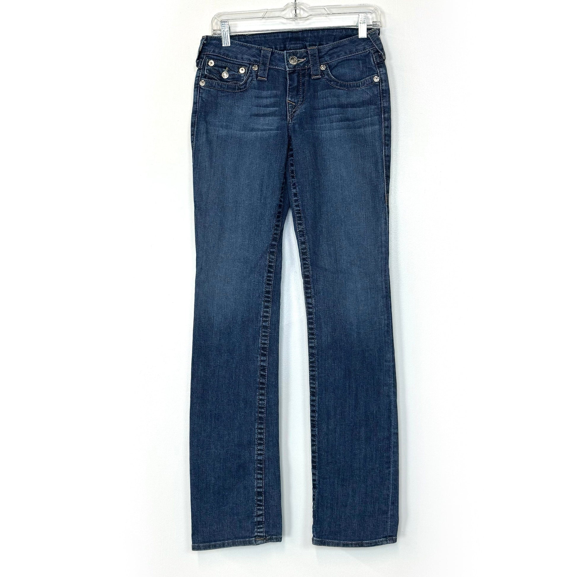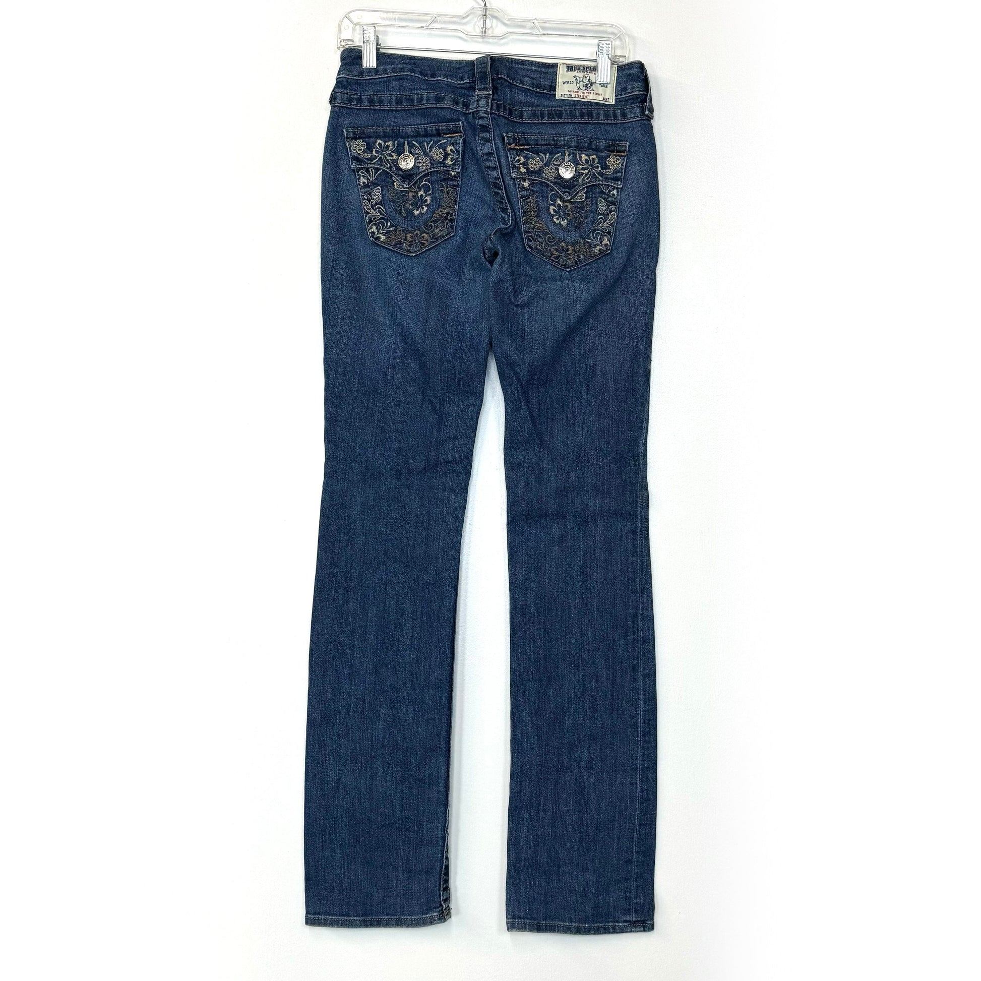 True Religion Straight Denim Embroidered Pocket Jeans – Machine Washable Comfort for Women – Available in Blue, Size 27