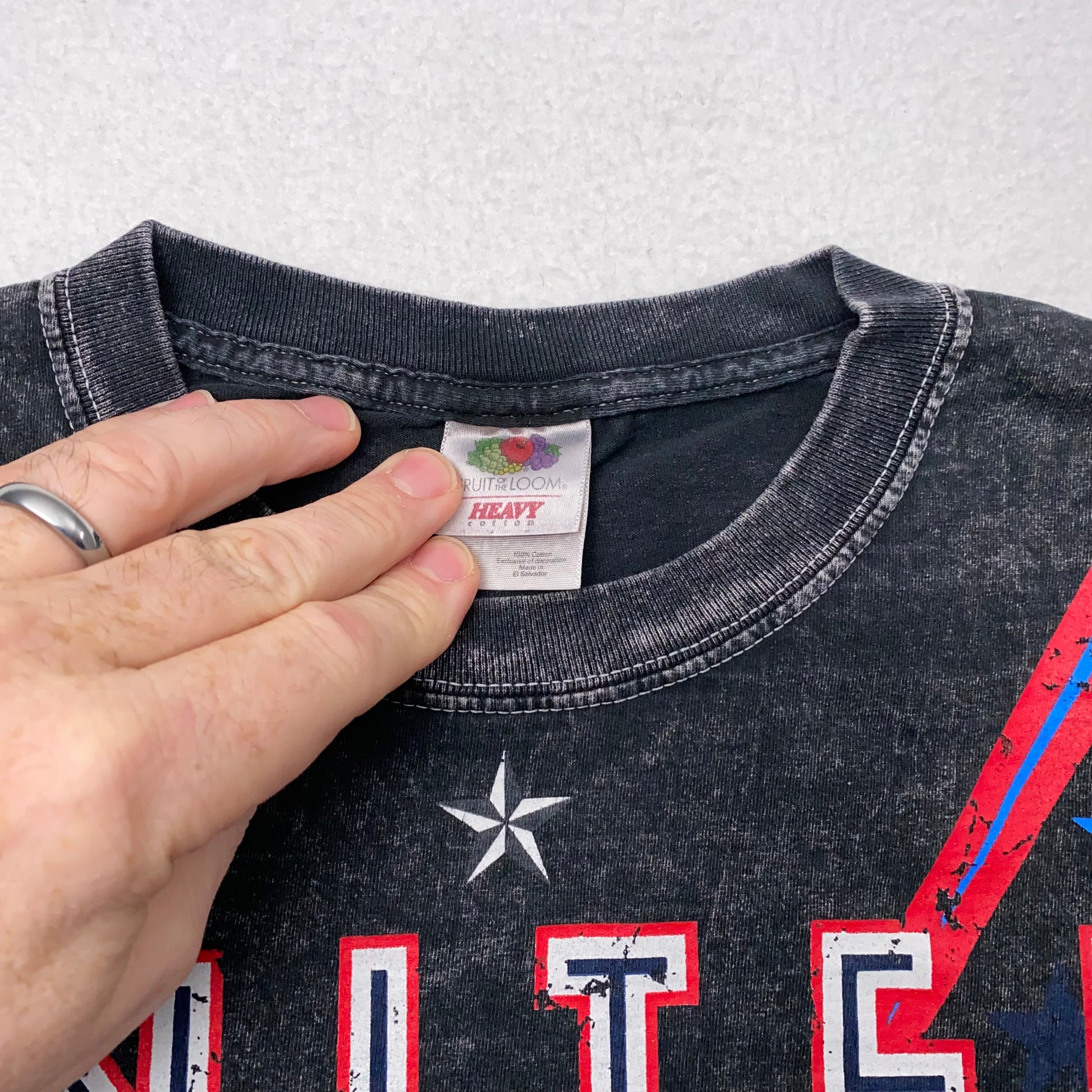 - Design: Vintage wash with 'United States of America' graphic on the front and '1776' on the back.