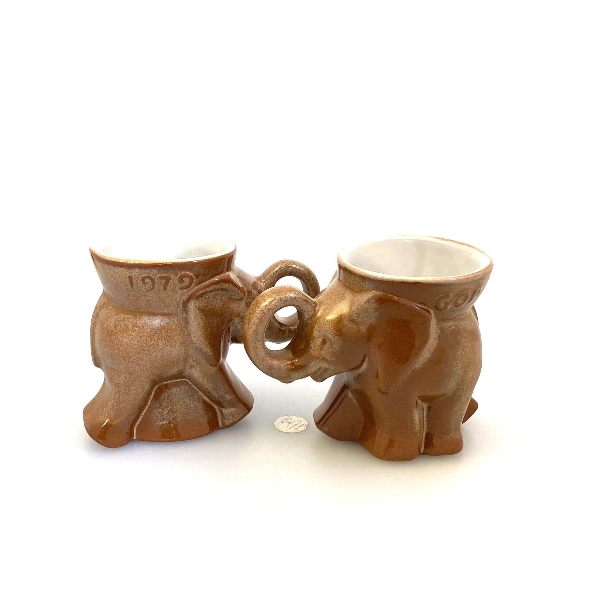 Vintage Frankoma 1979 Republican GOP Elephant Mugs Coffee Cups, Brown Drip Glaze Set of 2 NOS