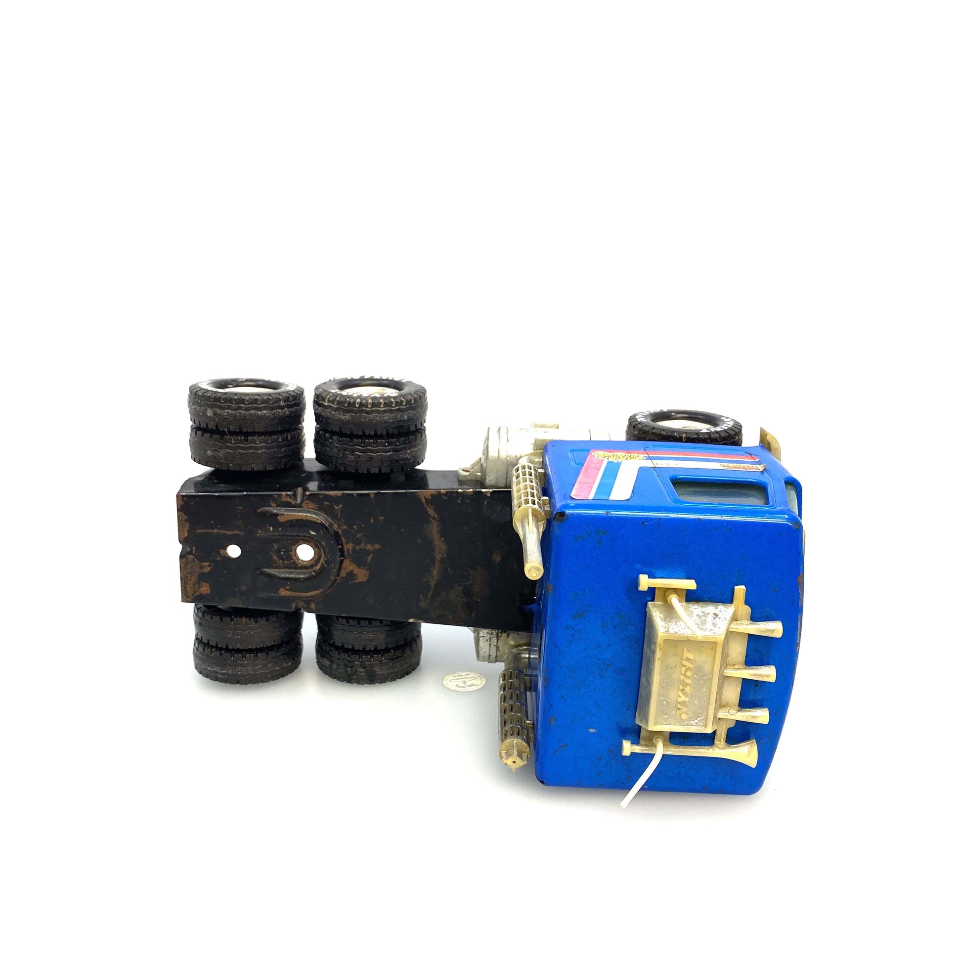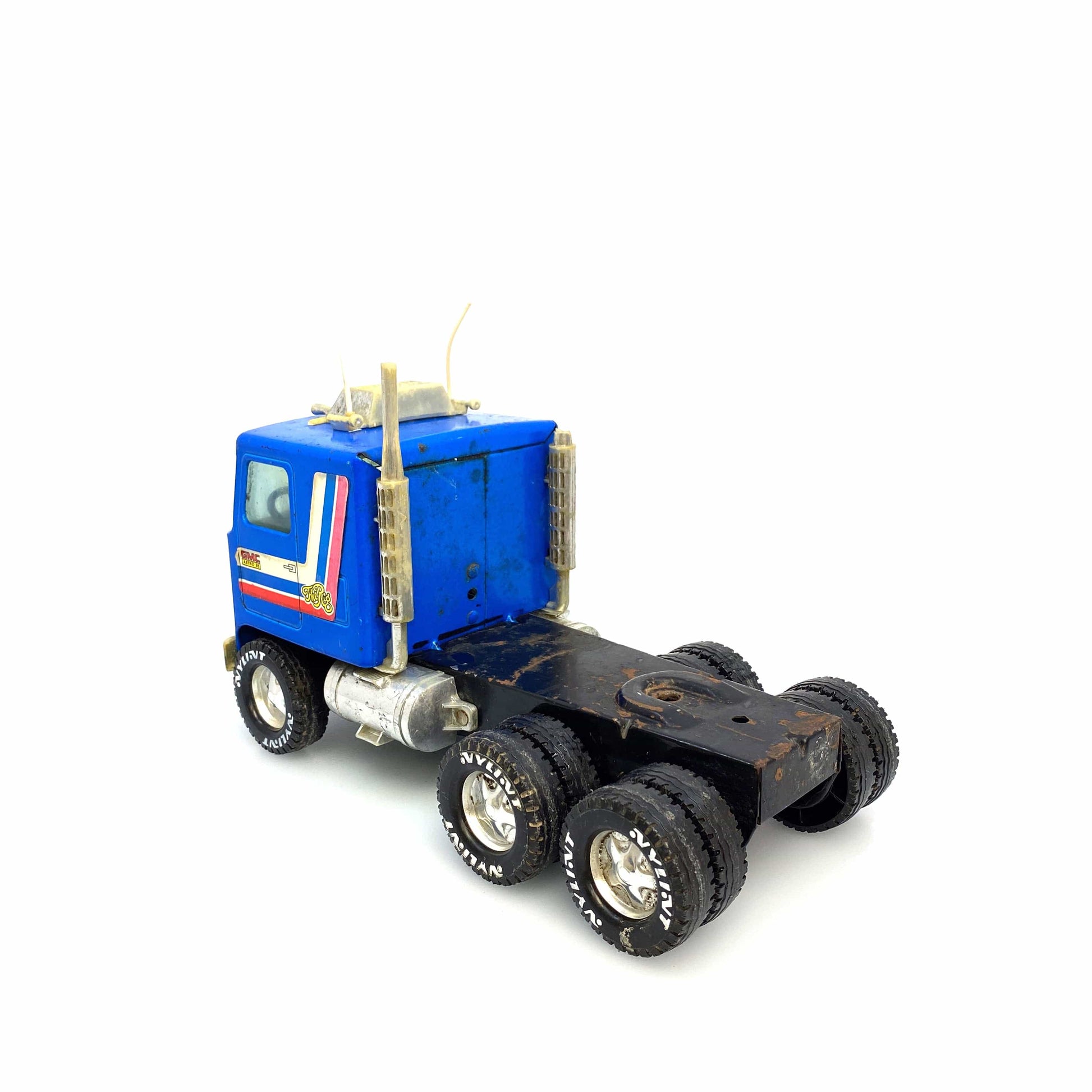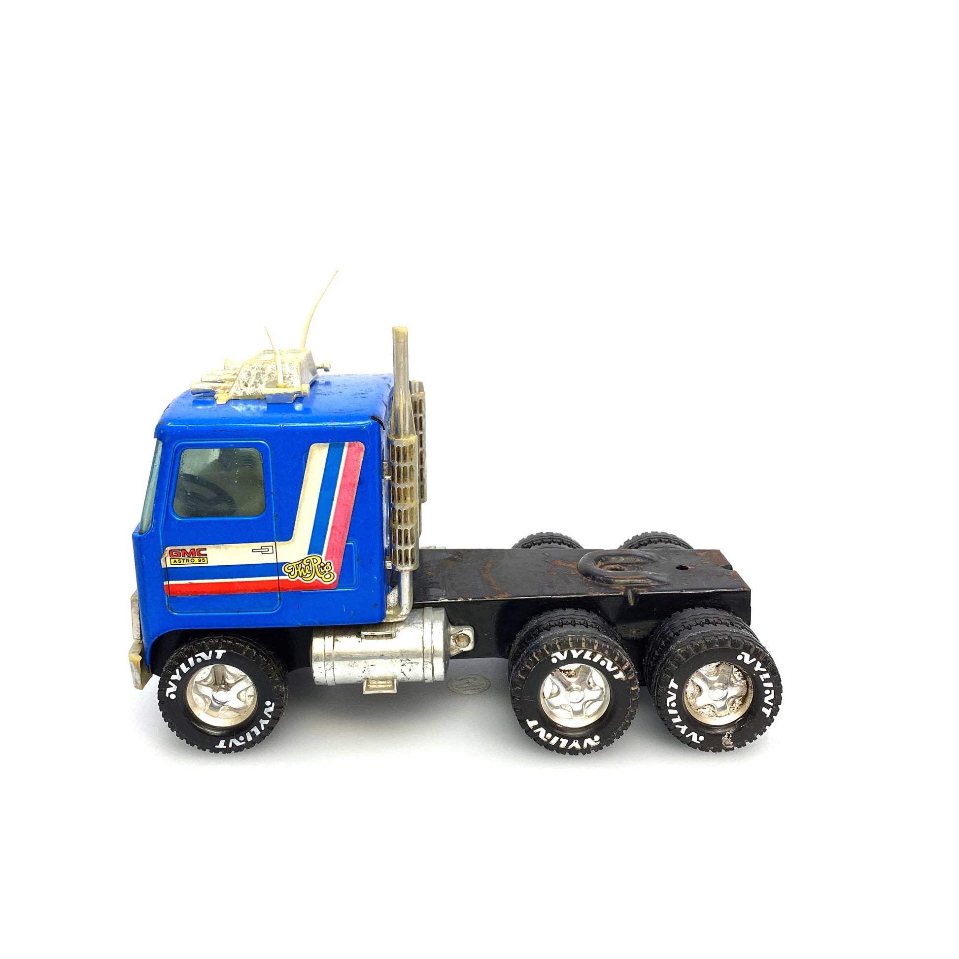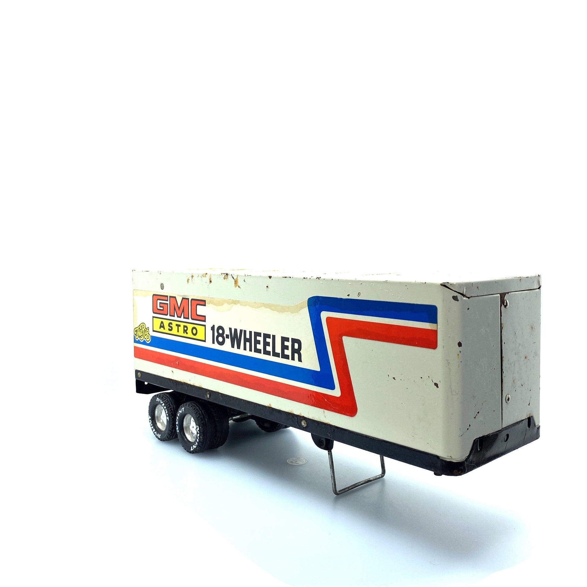 Experience the nostalgia of the vintage Nylint GMC Cab over Astro Tractor Trailer. This 18-wheeler "The Rig" Semi Truck is a true American classic. With its blue and white design, it's perfect for both kids and adults who love toy trucks and construction vehicles. Made with high-quality metal, this truck is built to last. Get ready for hours of fun and adventure with this 22" beauty.