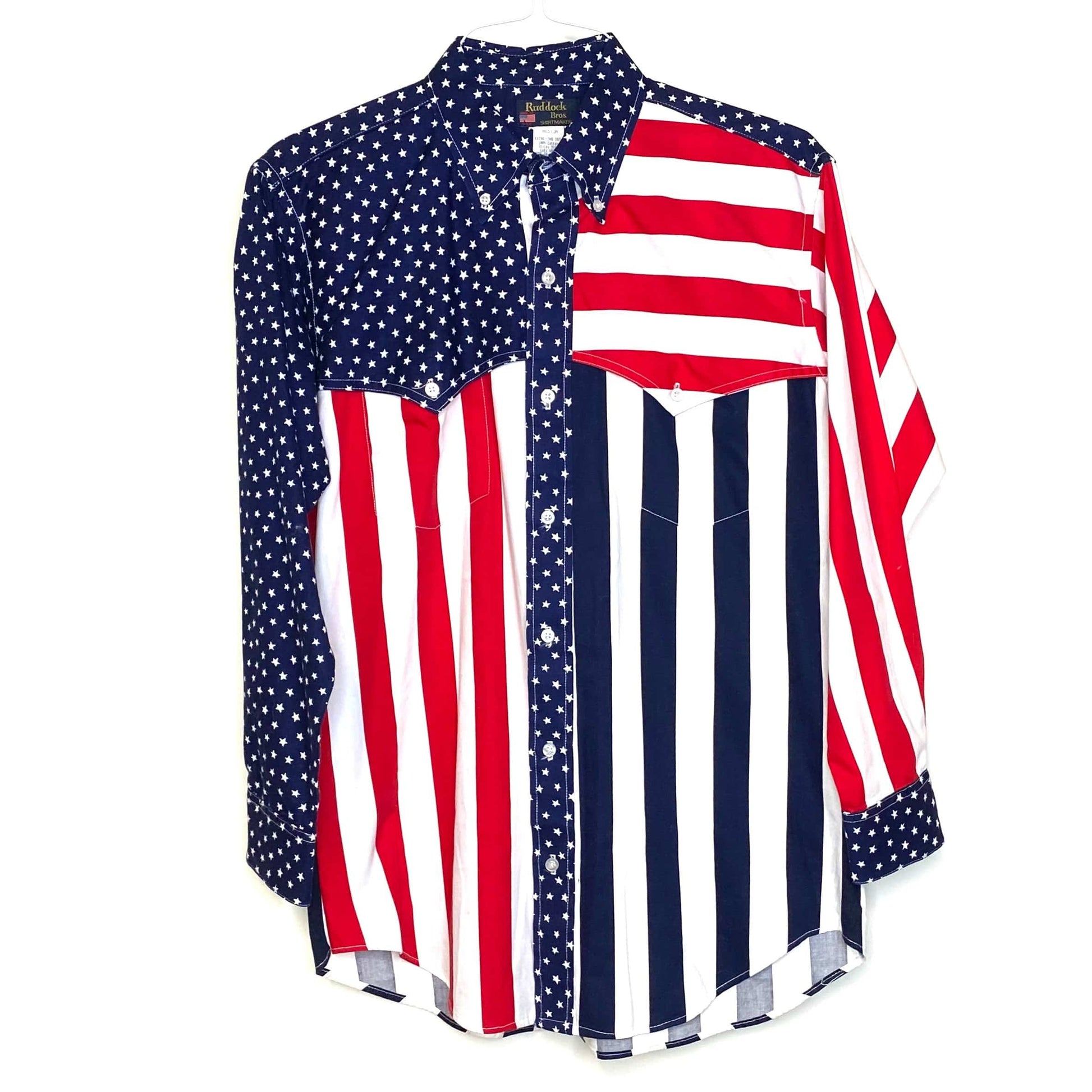 Step up your style game with this vintage Ruddock Shirtmakers button-down shirt. Made from comfortable cotton knit fabric, this red, white, and blue shirt features a classic American flag design. With its long sleeves and excellent condition, it's perfect for the upcoming spring/summer season. Don't miss out on this unique and patriotic piece!
