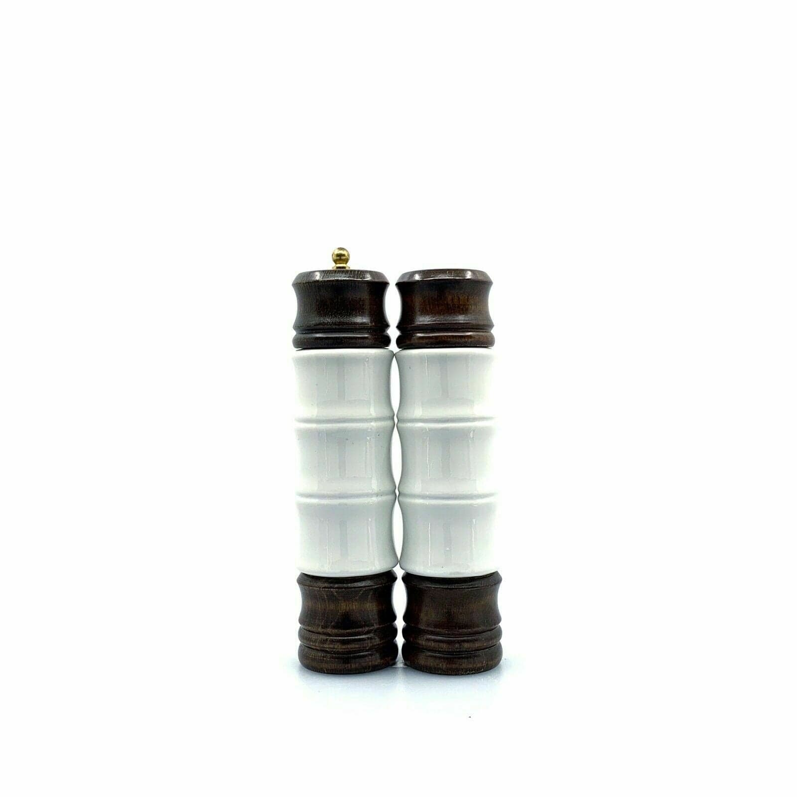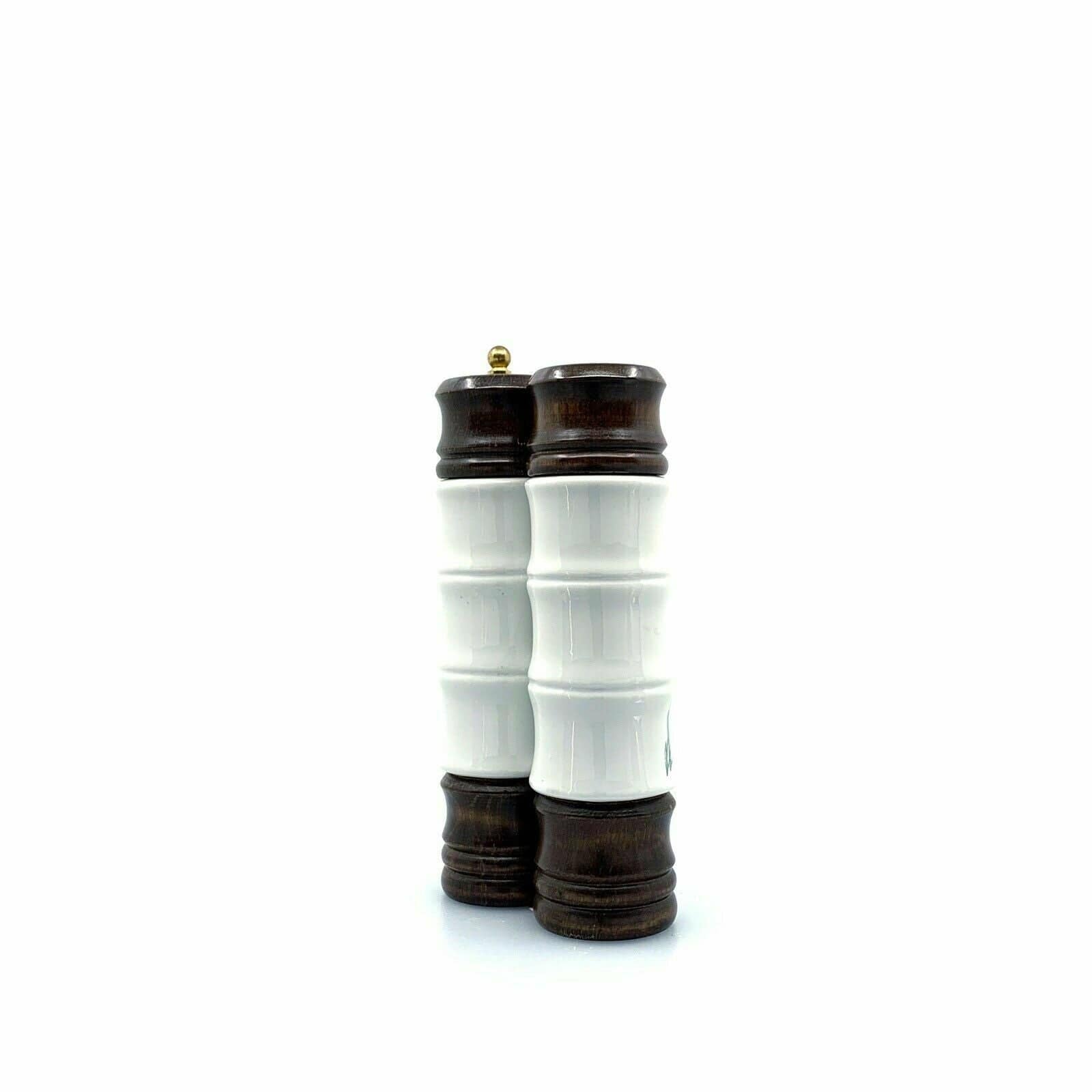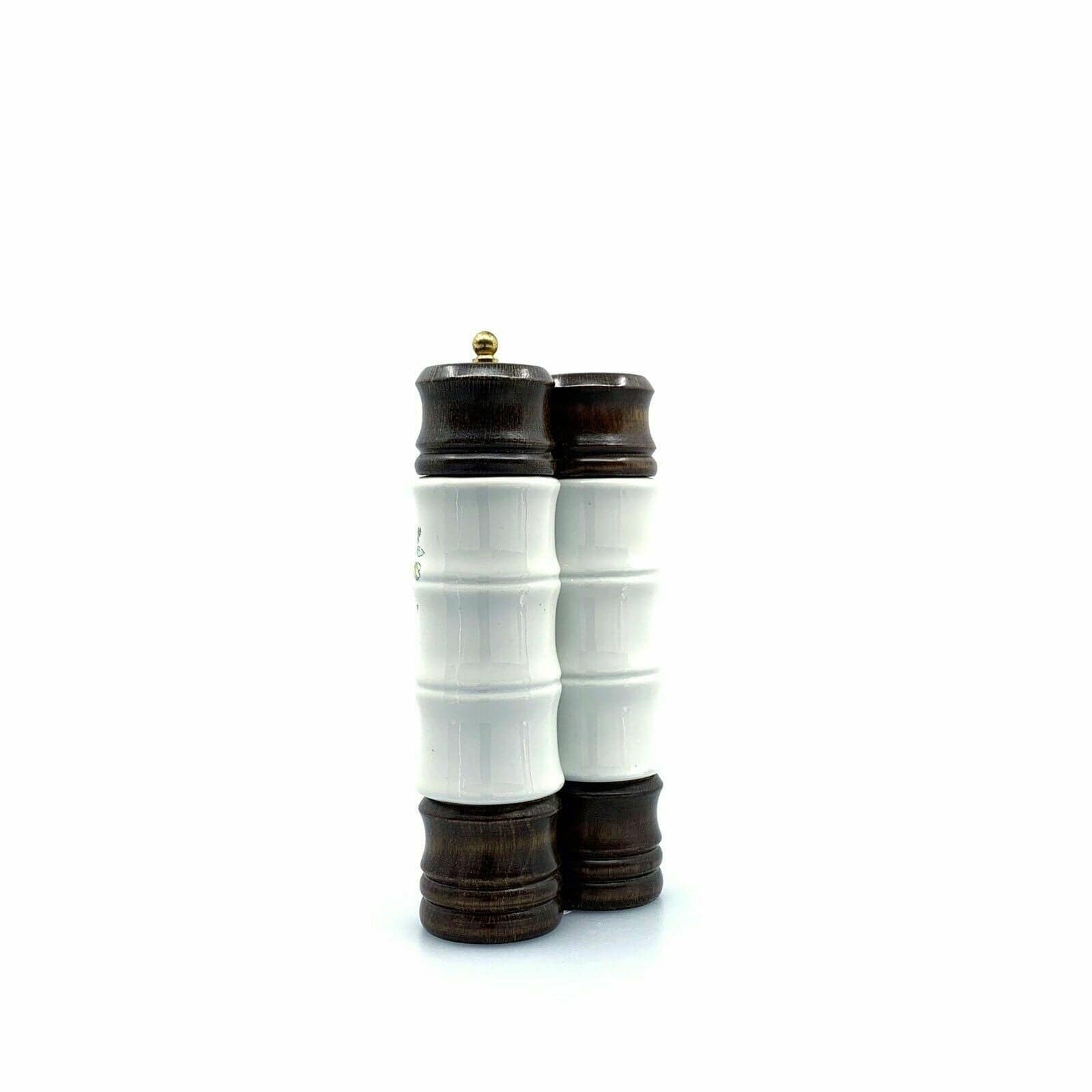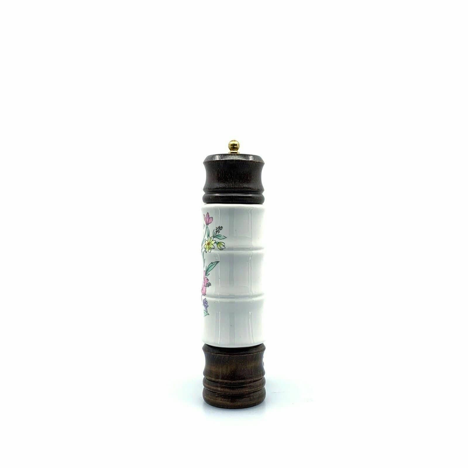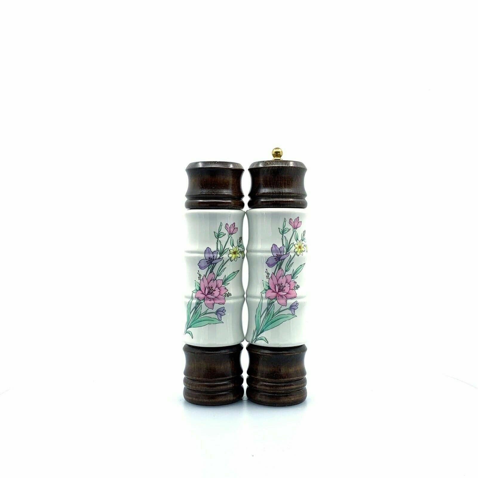 Vintage Spring Flowers Pepper Shaker Grinder & Salt Shaker White Ceramic/Wood 9"