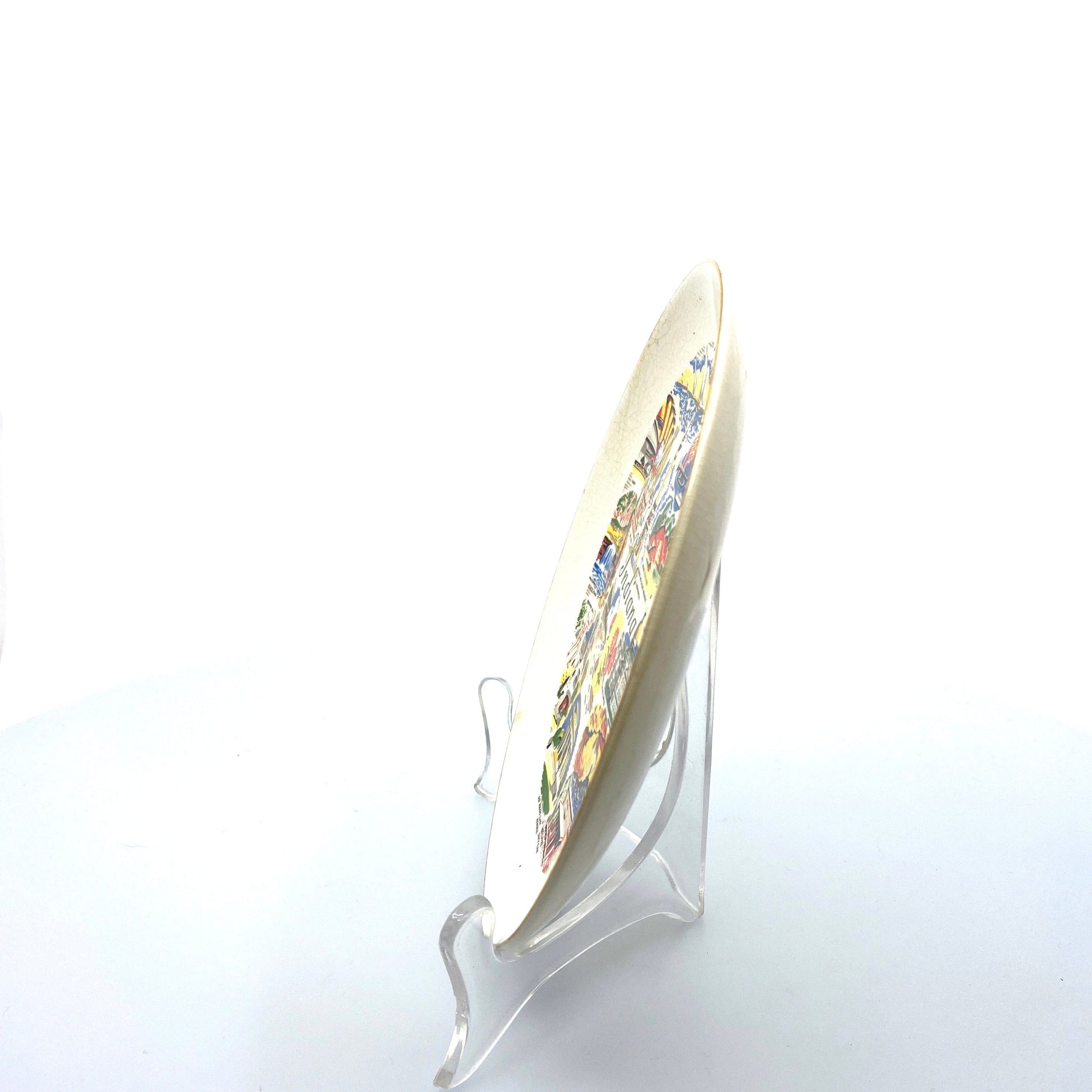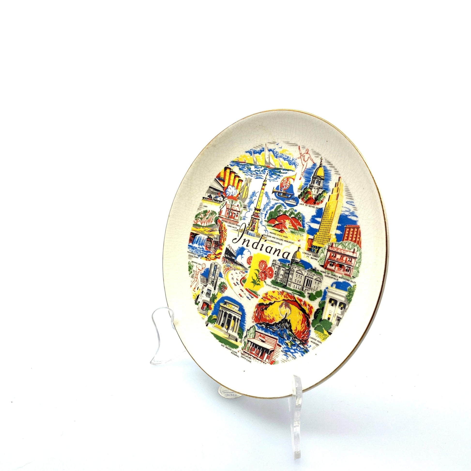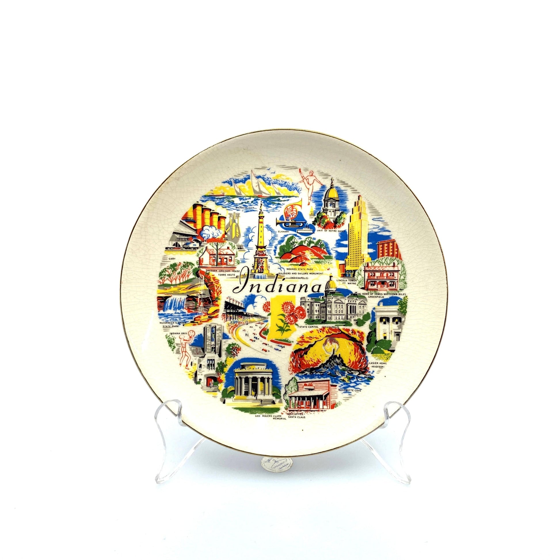 Bring a touch of vintage charm to your home with this collectible Indiana souvenir plate. Made of porcelain, this 7.5" plate features a beautiful design showcasing the state's landmarks. Perfect for any decor, this plate is a must-have for travel enthusiasts and collectors alike.